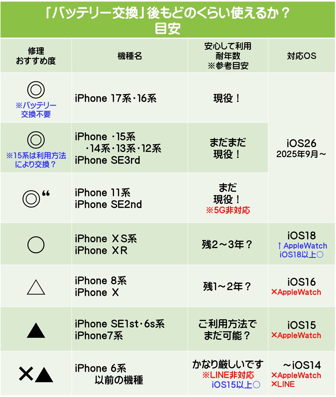 どうしようか?悩んでいる場合下記を参考に「自分のは?」※◎の機種は特にバッテリー交換おススメです♪