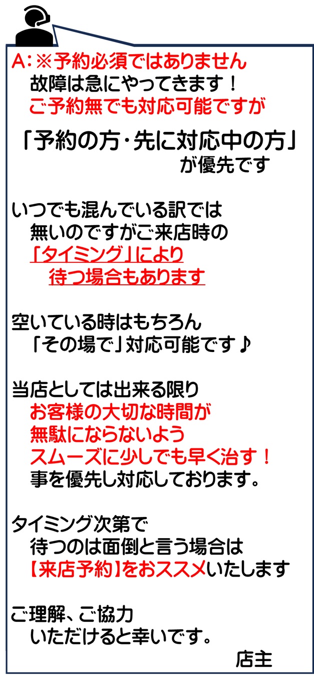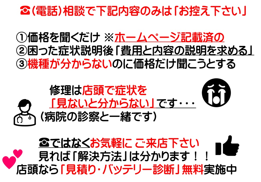 | ~お気軽に「ネット予約」~ 👉受付別の予約可能時間一覧 ※当日予約は【電話】のみとなります ◆ネット予約注意点◆ 1:ご希望の項目が無い場合は「LINE・電話」にてお願いいたします 2:予約申請後①仮予約 →②本予約完了メールの受信をお待ち下さい ※上記②受信まで「予約は未確定」となり返答は営業時間中のみの対応となります 年末年始は特に「在庫が枯渇」する場合あります ご利用が多い「大容量バッテリー交換・画面交換」ネット予約専用