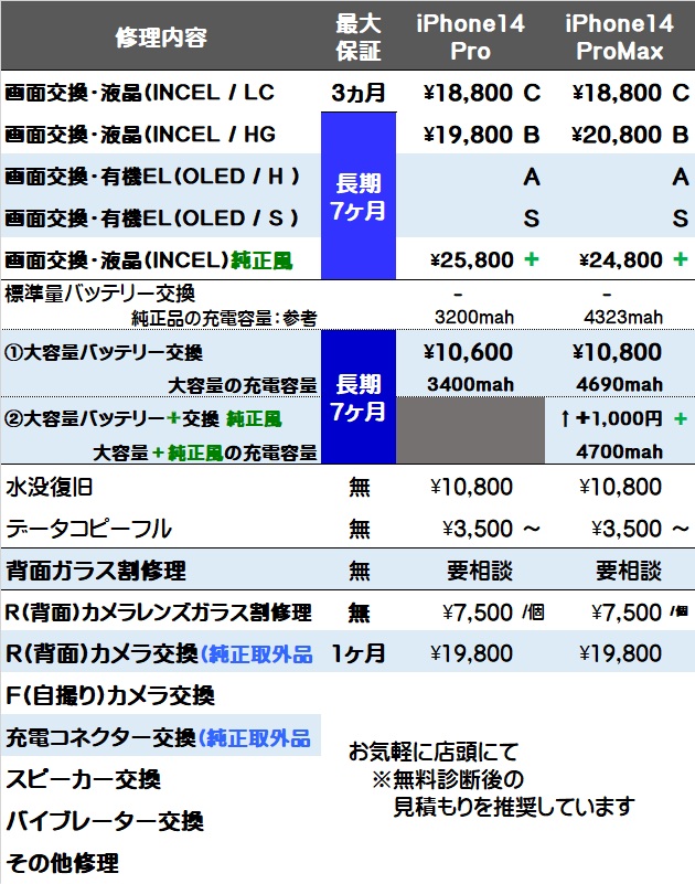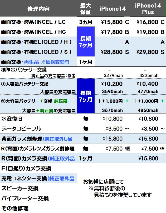 ※ネット予約受付は「前日の午前中まで」となります 👉受付別の予約可能時間一覧 ◆ネット予約注意点◆ ⑴ご希望の項目が無 い場合「 ネット予約以外 」をご利用下さい ⑵「①仮予約 ⇒ お店より②本予約通知の送信後 ⇒ ③本予約完了」となります ※希望の機種項目が無い場合はネット予約は不可となります 修理ご利用で多い 【大容量バッテリー交換・画面交換】希望のお客様へ ※もう既に価格など確認済の場合はこちらが便利です ◆大容量バッテリー交換 専用 👉大容量バッテリー 👉大容量バッテリー★純正風Ver ※エラー表示が無い商品です ◆画面交換 専用 👉画面交換:純正同等 👉画面交換:互換品(安く修理/HG ※ホームボタンが無い機種が対象です ◆注文対応 専用 価格表に価格記載がありますが 上記に項目が無い修理となります ※オンライン決済は「クレジットカード必須」となります 👉(オンライン前決済) 大容量バッテリー or 旧機種 |