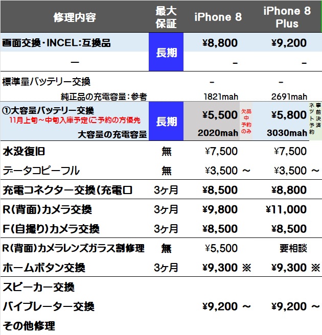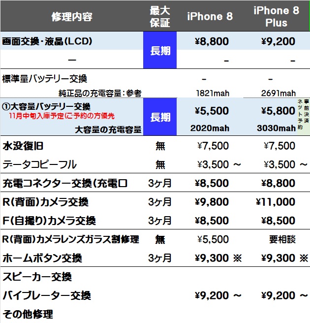 ※ネット予約受付は「前日の午前中まで」となります 👉受付別の予約可能時間一覧 ◆ネット予約注意点◆ ⑴ご希望の項目が無 い場合「 ネット予約以外 」をご利用下さい ⑵「①仮予約 ⇒ お店より②本予約通知の送信後 ⇒ ③本予約完了」となります ※希望の機種項目が無い場合はネット予約は不可となります 修理ご利用で多い 【大容量バッテリー交換・画面交換】希望のお客様へ ※もう既に価格など確認済の場合はこちらが便利です ◆大容量バッテリー交換 専用 👉大容量バッテリー ◆画面交換 専用 👉画面交換:純正同等 ◆注文対応 専用 価格表に価格記載がありますが 上記に項目が無い修理となります ※オンライン決済は「クレジットカード必須」となります 👉(オンライン前決済) 大容量バッテリー or 旧機種 |