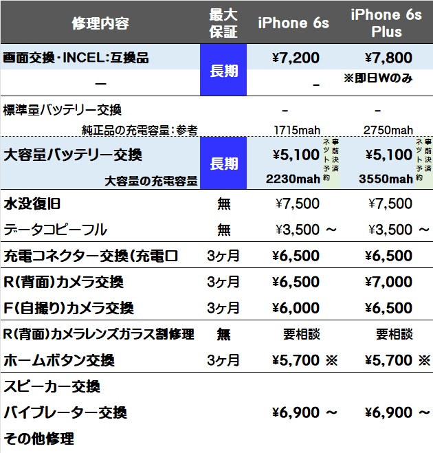 ※ネット予約受付は「前日の午前中まで」となります 👉受付別の予約可能時間一覧 ◆ネット予約注意点◆ ⑴ご希望の項目が無 い場合「 ネット予約以外 」をご利用下さい ⑵「①仮予約 ⇒ お店より②本予約通知の送信後 ⇒ ③本予約完了」となります ※希望の機種項目が無い場合はネット予約は不可となります 修理ご利用で多い 【大容量バッテリー交換・画面交換】希望のお客様へ ※もう既に価格など確認済の場合はこちらが便利です ◆大容量バッテリー交換 専用 👉大容量バッテリー 👉大容量バッテリー★純正風Ver ※エラー表示が無い商品です ◆画面交換 専用 👉画面交換:純正同等 👉画面交換:互換品(HGで安く修理 ※ホームボタンが無い機種が対象です ◆注文対応 専用 価格表に価格記載がありますが 上記に項目が無い修理となります ※オンライン決済は「クレジットカード必須」となります 👉(オンライン前決済) 大容量バッテリー or 旧機種 👉(オンライン前決済) 画面交換:互換品(LPで激安修理 |