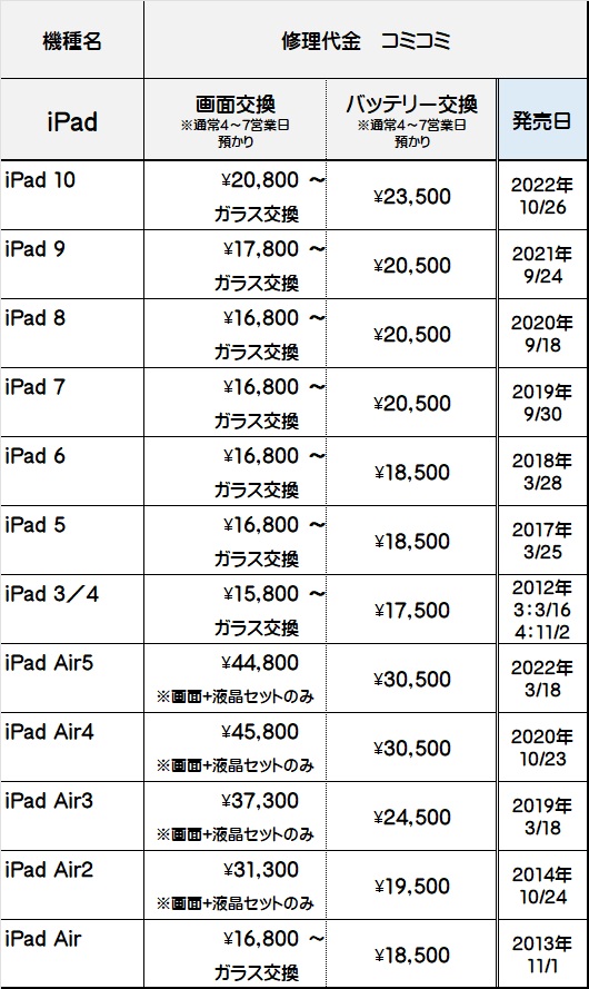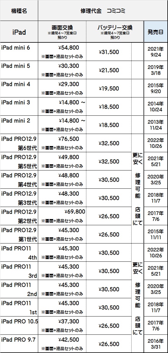 下記価格表に無い修理も対応しております、詳しくはお問合せ下さい。