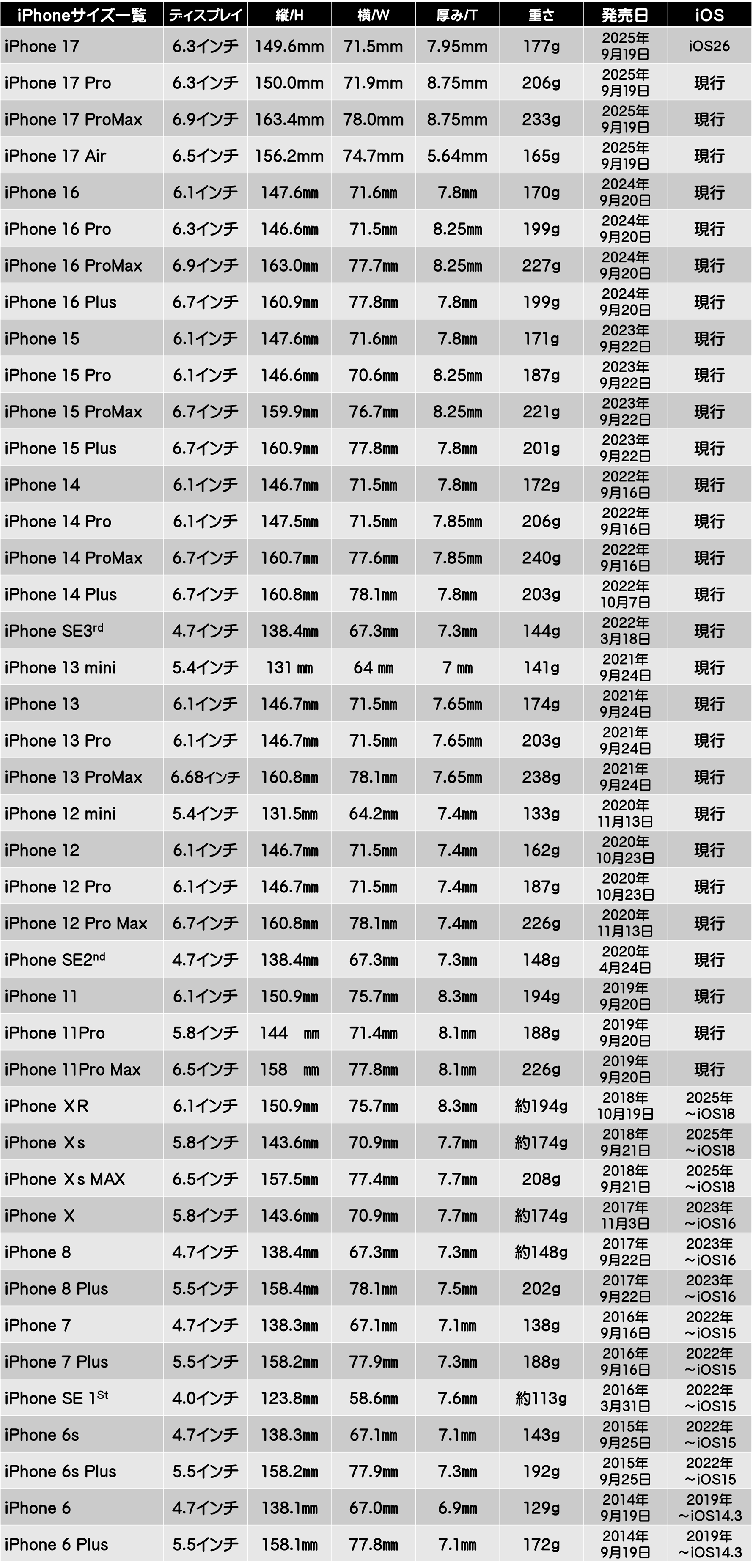 ■iPhone発売日一覧:お使いの機種確認などに ※パソコン閲覧の場合、並びが若干前後します