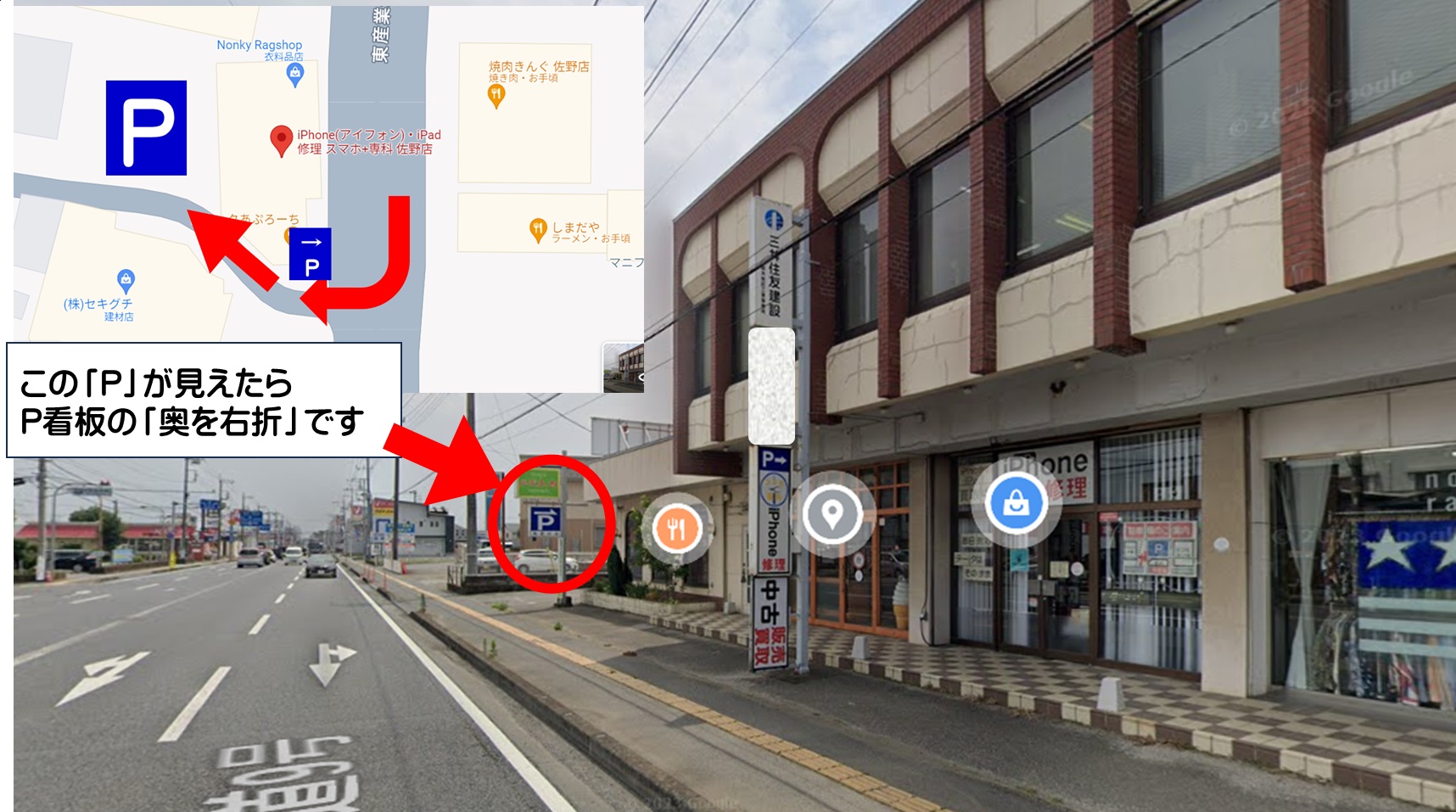 ①南(50号バイパス)→北(カインズホーム)方面【P】入口説明②北(カインズホーム)→南(50号バイパス)方面【P】入口説明