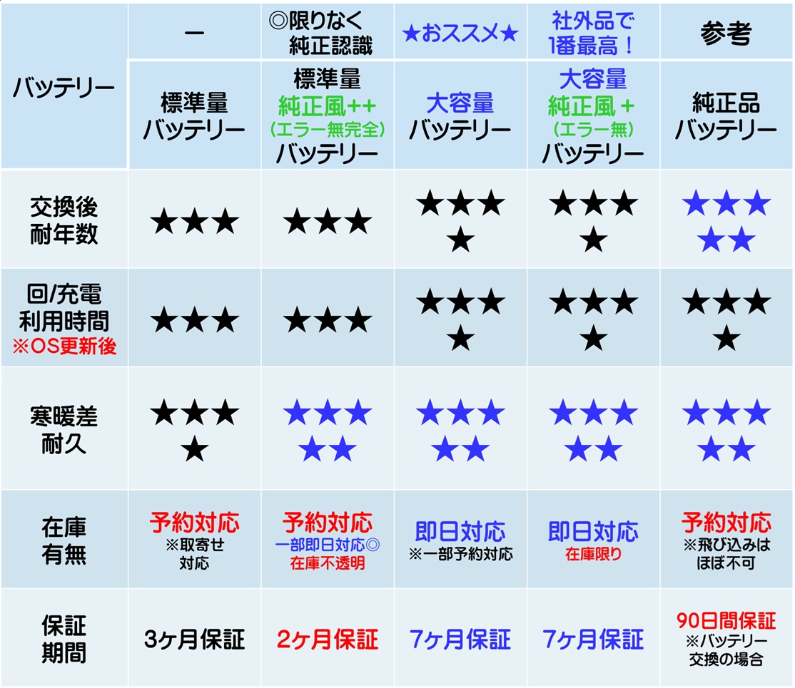 ※ネット予約受付は「前日の午前中まで」となります 👉予約受付可能一覧 ◆大容量バッテリー交換 専用◆ 👉大容量バッテリー 👉大容量バッテリー純正風+ 👉標準量バッテリー純正風++ 👉(オンライン前決済)「大容量バッテリー or 旧機種」の受注発注l機種 ※オンライン決済はクレジットカード必須となります ※希望の機種項目が無い場合はネット予約不可となります |